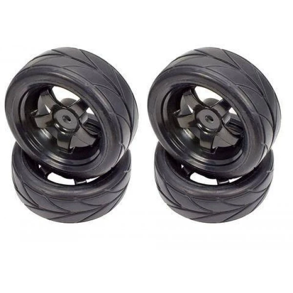 - 4 Premounted Rubber Sedan Wheels / Tires – These Will NOT Work On 1/10 Trucks Or Buggies