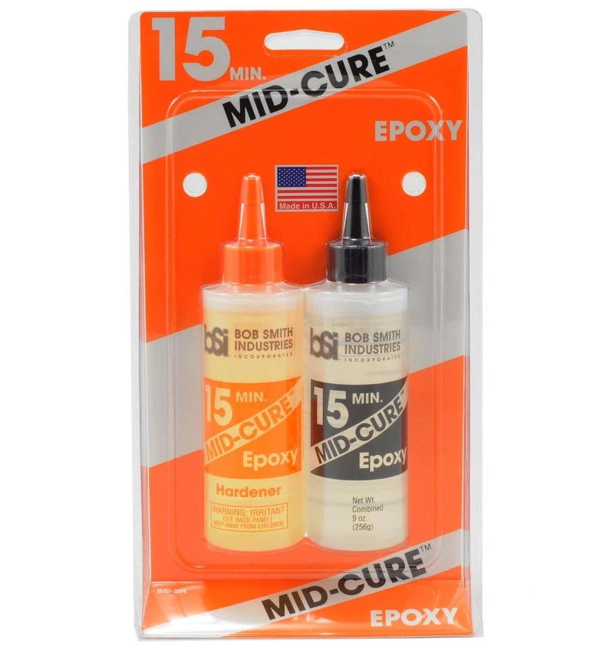Bob Smith Industries MID-CUREâ„¢ 15 Minute Epoxy. MID-CUREâ„¢ 15 Minute epoxy is used in larger areas where more working time is needed. It is more water resistant and can be used as a substitute for QUIK-CUREâ„¢ in most applications. MID-CUREâ„¢ is BSI’s most flexible epoxy and is ideal for gluing to fiberglass surfaces. Allow 45 minutes before handling parts and 2 hours for full strength.