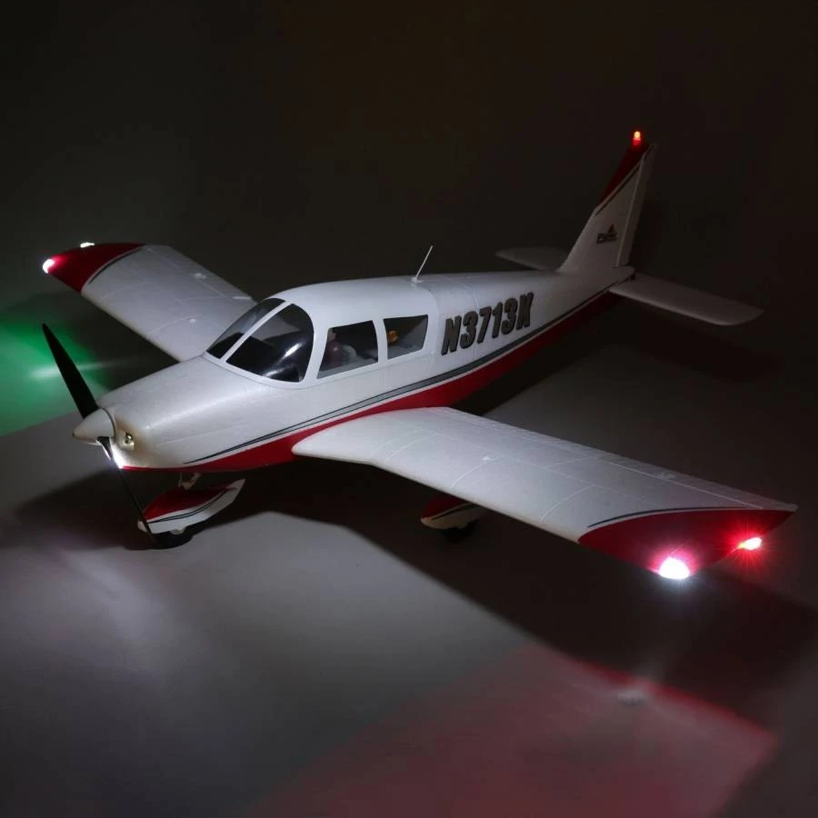 An accurate scale outline captures the iconic shape of the Cherokee including the constant chord wing that’s equipped with operational slotted flaps to deliver improved low-speed handling, shorter take offs and slower landings. The unique full-flying stabilator (stabilizer/elevator) offers authentic pitch control while the functional shock-absorbing nose strut and large wheels make it possible to fly from a wide variety of surfaces. And factory-installed LED lighting, including navigation lights, strobes on the wing tips, a tail beacon and landing lights, add to the realism and authenticity.