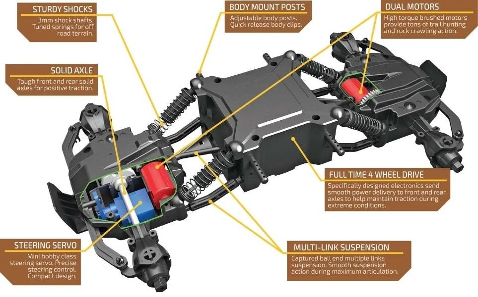 The Trail Hunter includes dual high torque brushed motors that provide tons of trail hunting and rock crawling action. Full time 4 wheel drive sends smooth power delivery to both the front and rear axles to help maintain traction during extreme conditions. Included is a 2.4Ghz transmitter with a range of more than 170ft. The transmitter automatically binds to the truck, with an audible confirmation, finding a unique channel to allow 20 or more Trail Hunters to run at the same time without worrying about interference issues. Steering trim allows for precise adjustments for vehicle tracking and digital proportional steering and throttle control give you full precise control of your vehicle.