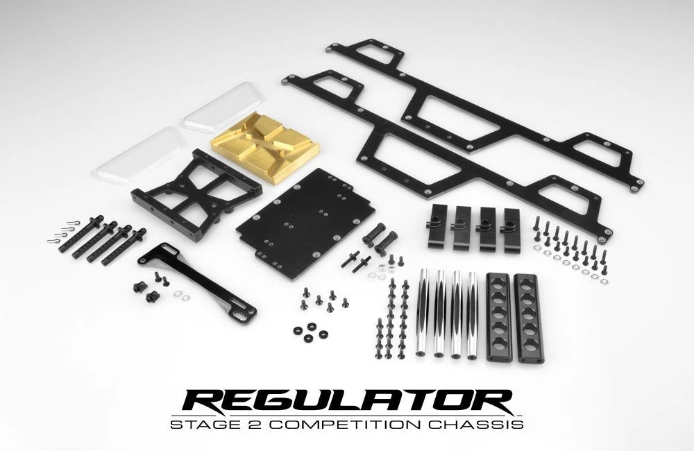 The key to the Regulator is the positioning of the battery and electronics in a top access layout and placed deep into the chassis for a low center of gravity. The fiberglass chassis and bottom plates hold the retro straight rail frame physique and at the base of the chassis, the heavy-duty aluminum cradle supports the suspension and ladder bars. In addition, a brass weight is included for racing in a sanctioned competition where a weight limit is used to even the playing field even further. The brass weight is mounted at an incredibly low position and locks into the cradle which aligns perfectly with the low center of gravity concept.