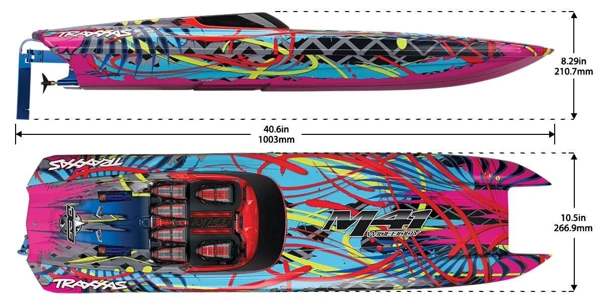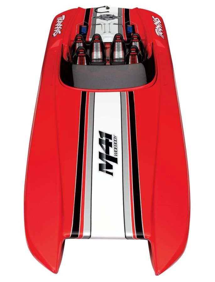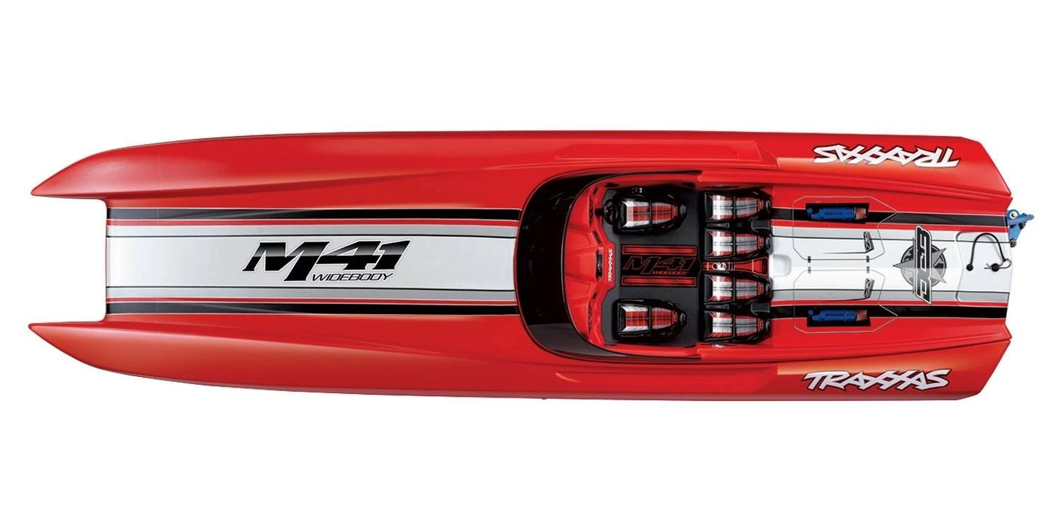 The DCB M41 Widebody catamaran, designed by DCB (Dave’s Custom Boats) founder Dave Hemmingson, is the largest model offered in the DCB M-Series. With its precision sculpted design and a pair of Mercury Racing 1350 engines, it speeds across the water at 175mph! Traxxas faithfully captured the incredible looks and performance of the DCB M41 in a detailed scale replica that is versatile, fun, and fast. The catamaran hull delivers the speed, stability and confidence for which the full-size M41 is famous, allowing you to have fun wherever your marine adventures take you. The M41 replica is equally at home blasting across the waves at the lake on a fun run or exploiting its 50+mph speed on a favorite stretch of smooth water. The razor sharp handling lets you carve turns with authority and precision and yet, offers easy control while cruising by the shore.