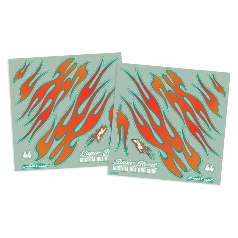 This is a Hot Rod Shop Universal Graphics Kit. Do you want to transform the look of your RTR body, Pro-Line tough color body, or even your custom painted body? Look no further than Pro-Line’s new Hot Rod Shop Universal Graphics kit! This sticker kit fits most 1:10 and 1:8 bodies on the market and features Hot Rod style flames in various sizes to make your car or truck stand out from the rest. It even includes small P-L logos in the flame Hot Rod style to complete the look! All the stickers included with this graphics kit are pre-cut and they are thicker than normal making them tougher and easier to install than your average decals. Add some Hot Rod flames to your ride with Pro-Line’s new Hot Rod Shop Universal Graphics Kit! Available now!