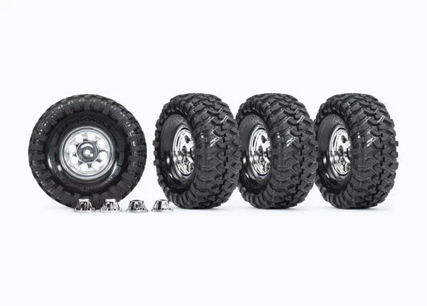 A set of four (4) Traxxas part #8183X, 1.9″ Tires and Wheels, assembled, glued (Classic chrome wheels, Canyon Trail 4.6×1.9″ tires)/ center caps (4) (requires TRA8255A extended stub axle)