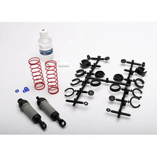 Traxxas oil-filled Ultra Shocks utilize X-rings for a perfect seal and super-smooth performance. The complete front set features two pre-assembled gray shock bodies (long) along with pre-load spacers, springs (2), and shock oil.