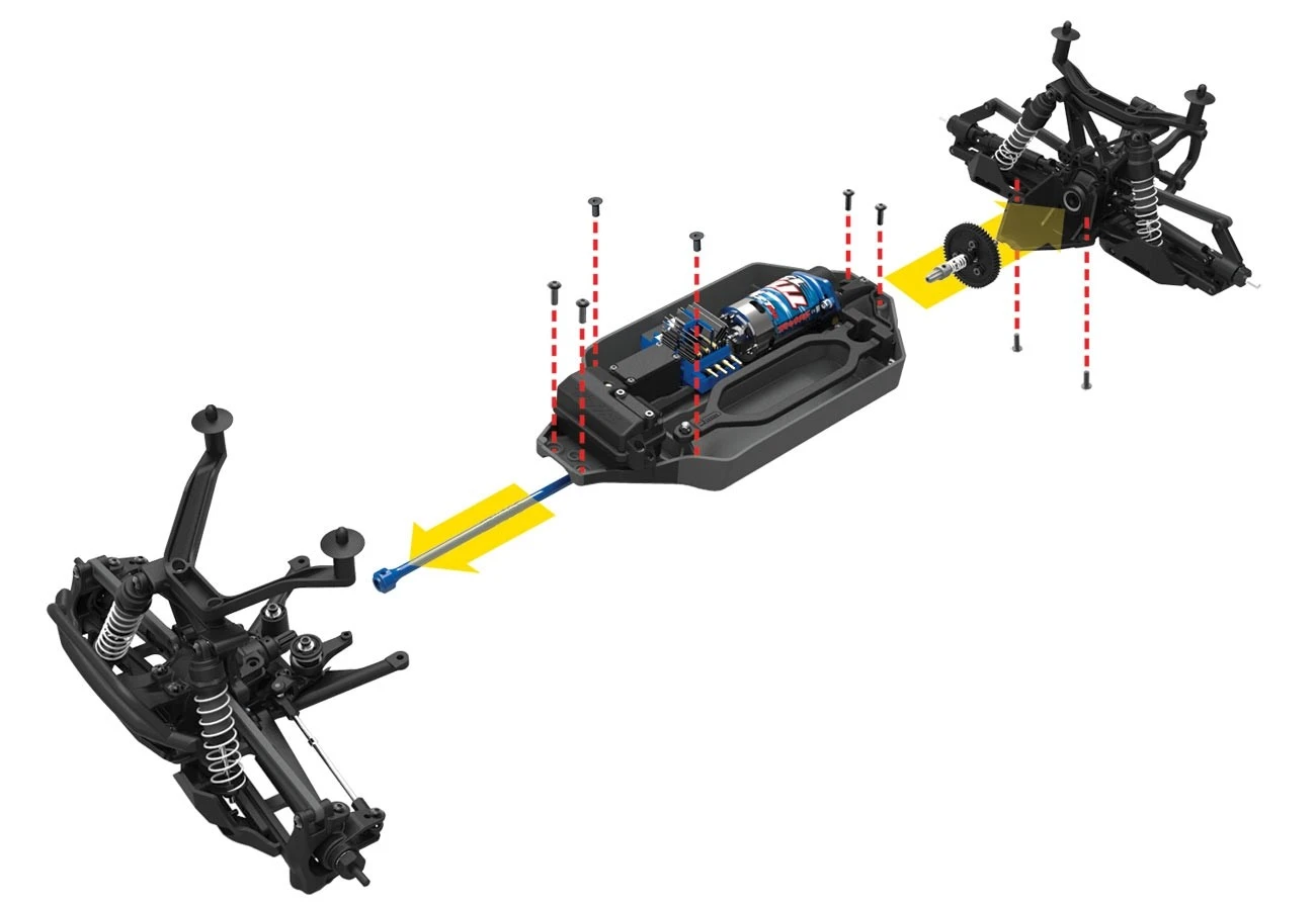 Old designs made servicing of 4-wheel drive vehicles cumbersome and time-consuming. Traxxas has a better way. Modular design allows the entire front section to be removed with just 5 screws, and the rear assembly with just 4 screws. In less than a minute using a power screwdriver, you have full access for easy service and adjustment.