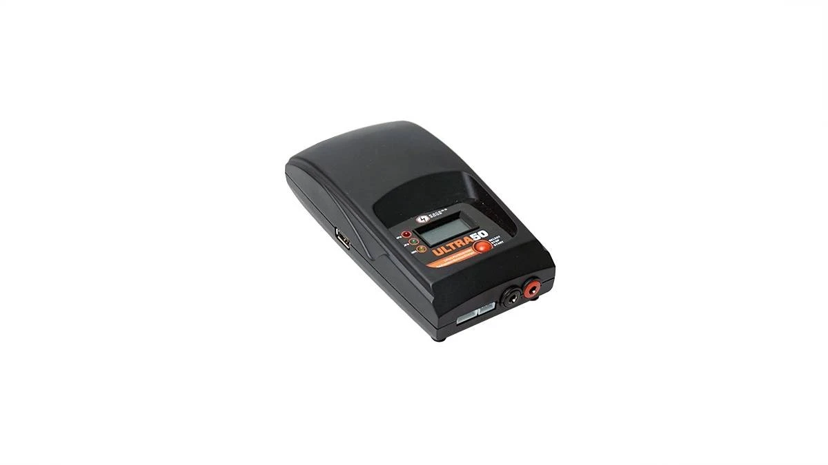 The Ultra 50 Multi-Chemistry LCD Charger is the ideal charger for virtually any battery type used in R/C vehicles, including Lithium Polymer (LiPo), Lithium-Ion (Li-ion), Lithium-Iron Phosphate (LiFe), Nickel Cadmium (Ni-Cd), and Nickel-Metal Hydride (NiMH). Conveniently powered by any 110v source or wall outlet, the Ultra 50 features an easy-to-read LCD screen and simple menu options accessed through one button. A powered USB outlet is also included for charging phones, tablets or other electronic devices along with a T-plug charging lead. Charges up to 3S (11.1v) LiPo and 8 cell (9.6v) chemistries at a maximum of 5A, while the compact size and durable construction make it a welcome addition to any modelers workbench and the 5-year warranty guarantees satisfaction.