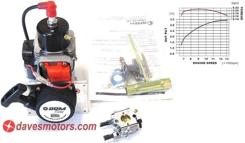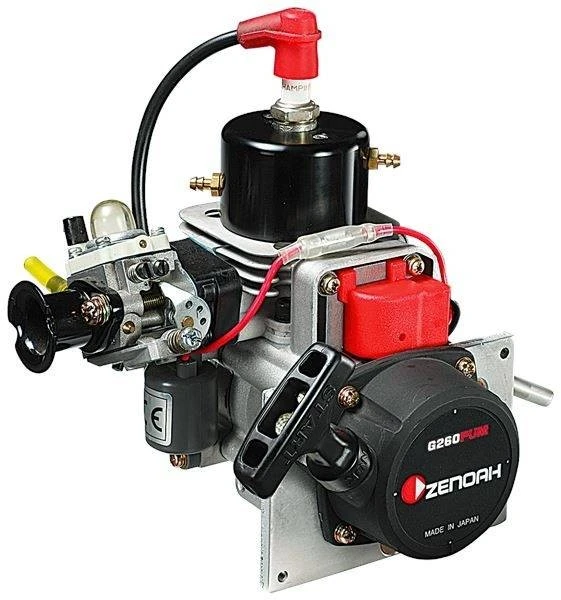 The Zenoah G260PUM watercooled engine is a 25.4cc (34mm bore, 28mm stroke) performance machine. It features a red silicone spark plug cap, 4 transfer port 34mm cylinder, high-performance single-ring piston, upgraded Walbro WT-257 carburetor (15.88mm bore, 12.7mm venturi, adjustable high and low jets), and re-designed “hemi”-style combustion chamber. Air filter and muffler not included.
